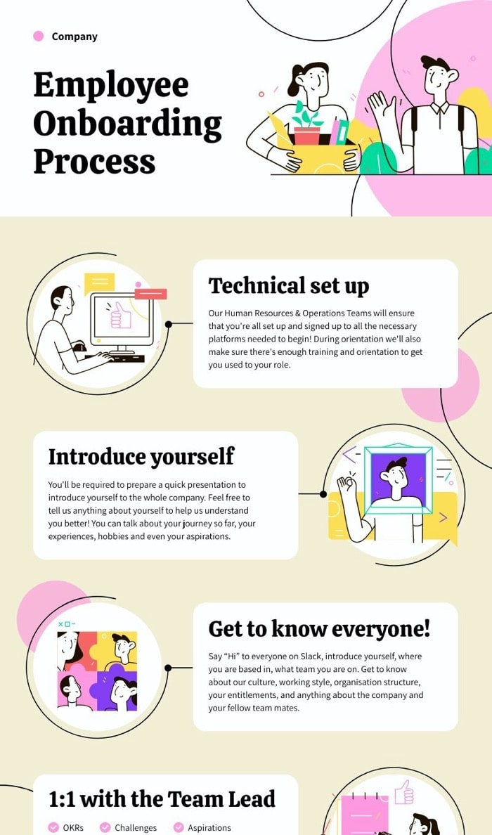 - Employee onboarding (images, icons, stock photos, interactive maps can be easily added to visuals with drag and drop)