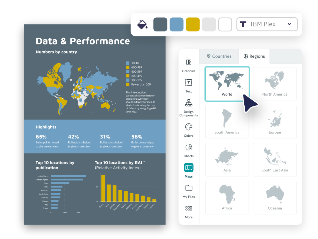 With Piktochart, access a world map, maps of 7 continents, and over 240 country maps to bring your data to life. Ideal for global to local data representation.