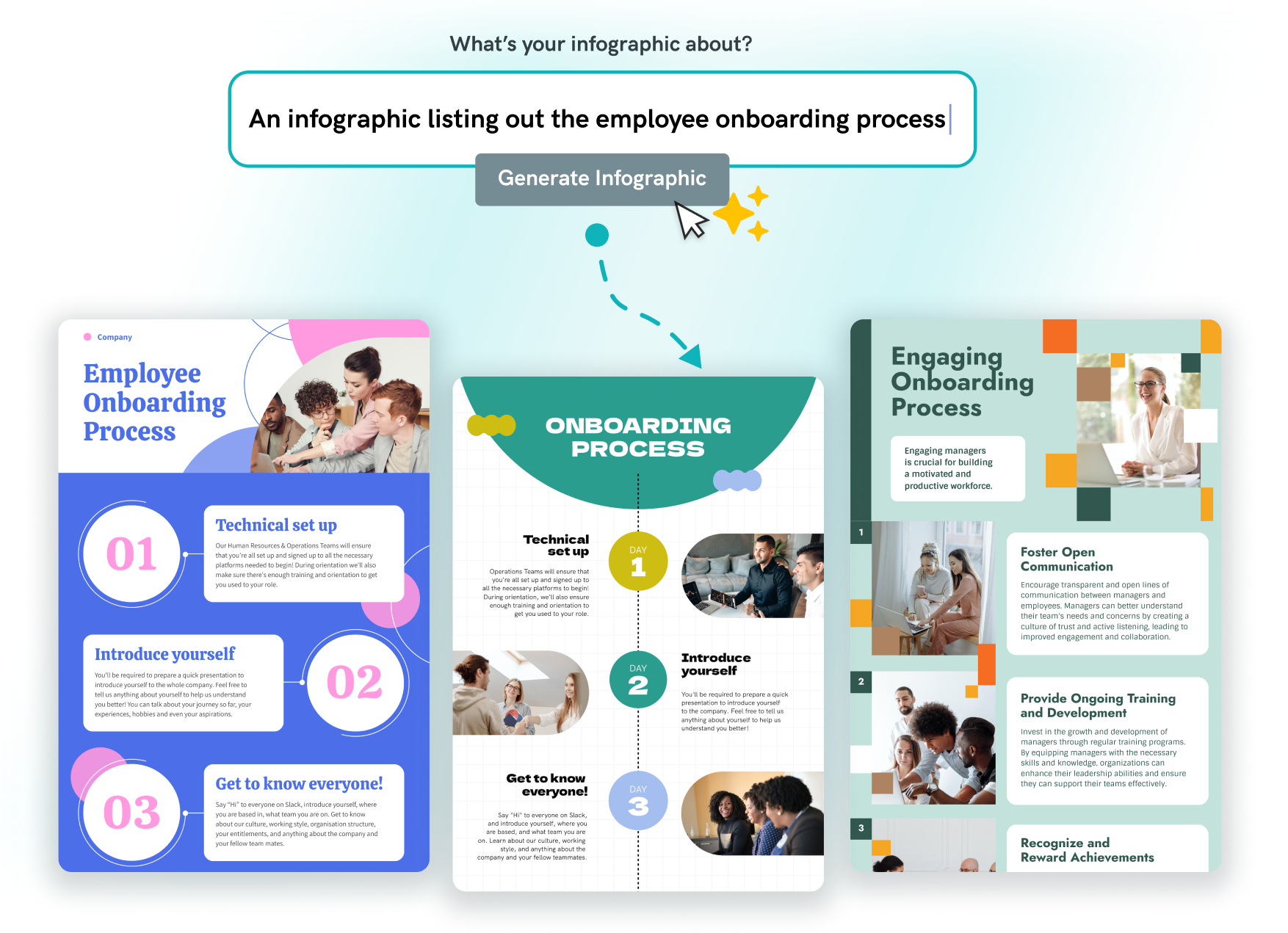 No more tedious design processes—just enter a topic, and let our AI infographic maker do its magic. Start with our AI-generated template, refine your message, and watch your vision unfold.